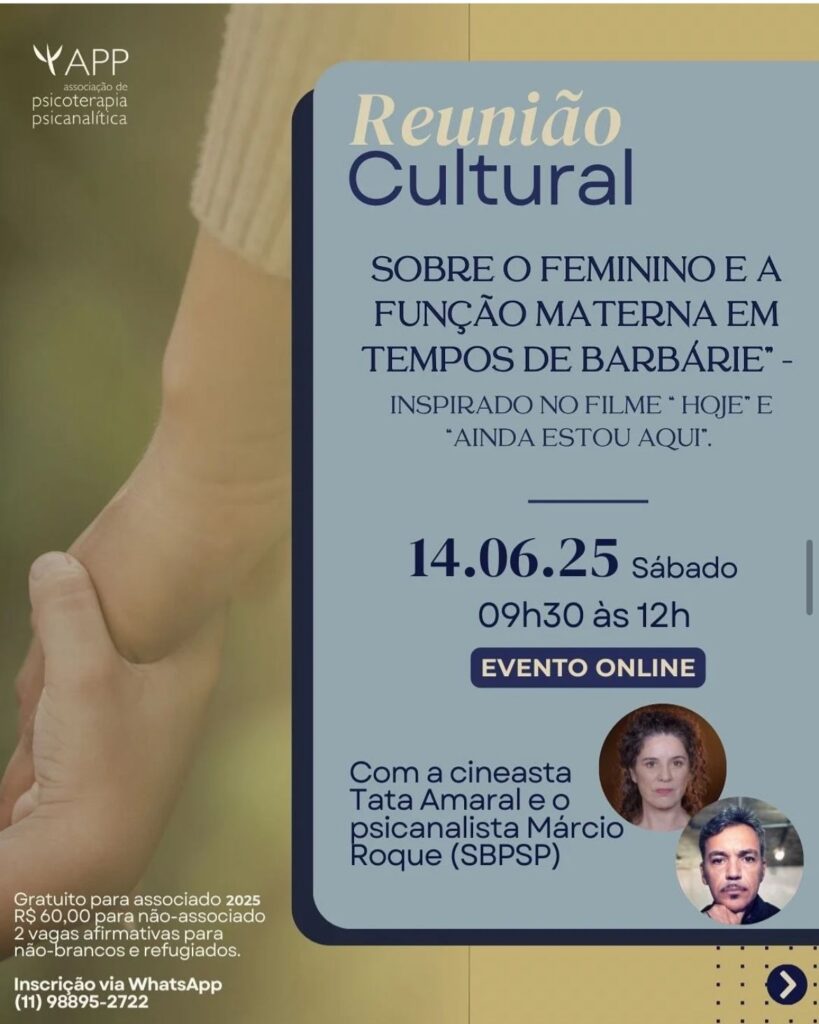 Contaremos com a renomada cineasta brasileira Tata Amaral e o psicanalista da SBPSP e HCFMUSP Marcio Roque para discutirem sobre – o feminino e a função materna em tempos de barbárie.